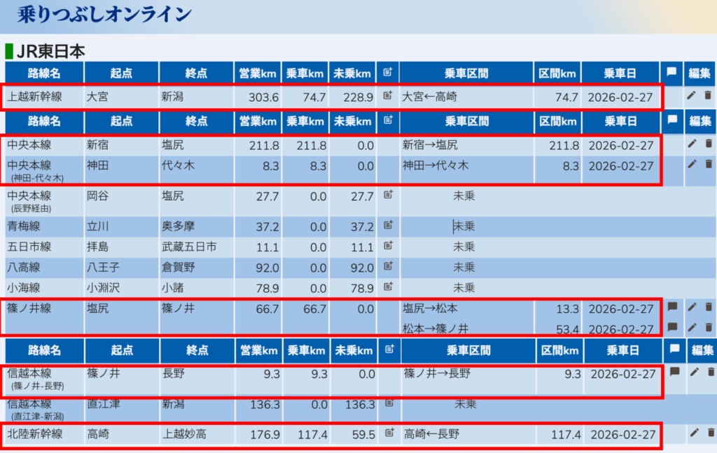 今回の旅で新たに乗車した区間を「乗りつぶしオンライン」に記録しました。